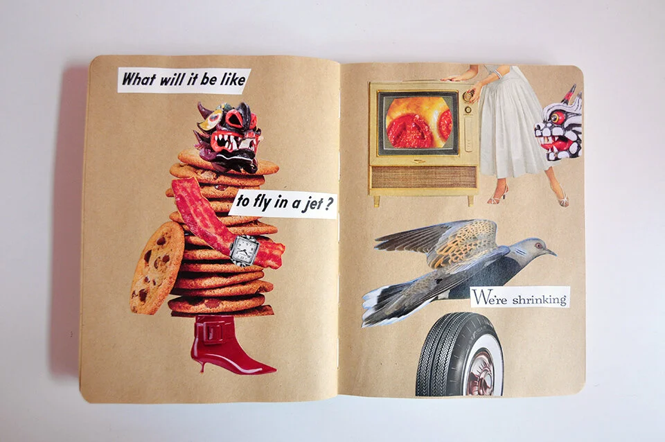 A collage from last year that features a stack of cookies with a face and a shoe, and the text: “What will it be like to fly in a jet?” (left), and a lady with a TV, a pigeon, and the text: “We’re shrinking” (right)