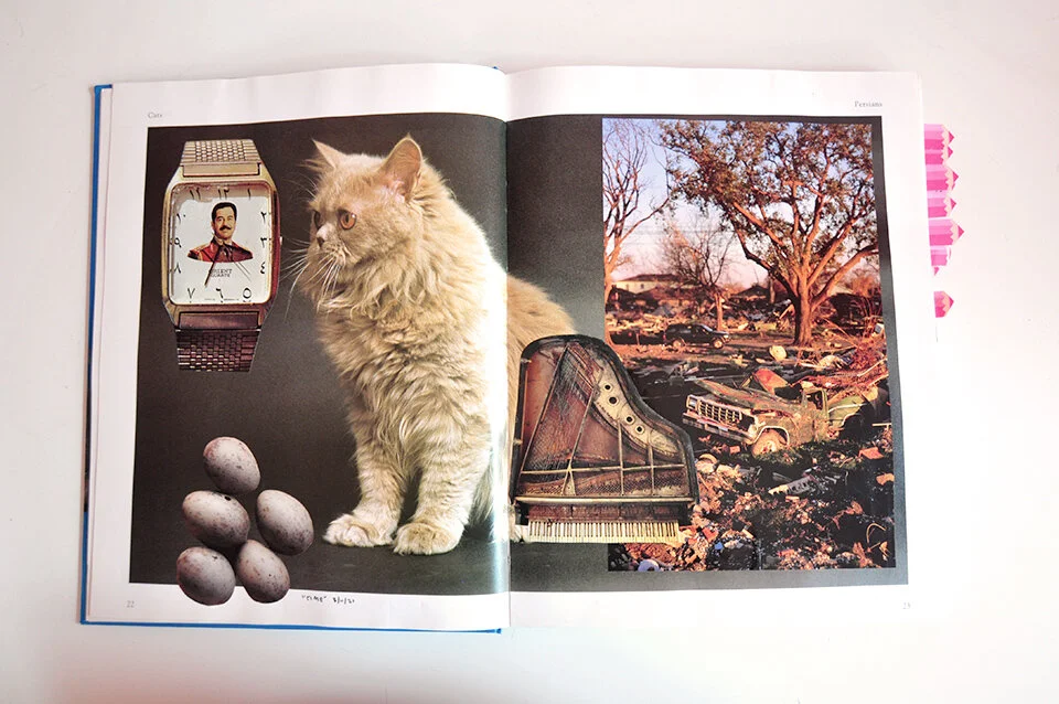 I made collages in a kraft paper sketchbook for about six months in 2020. When January 2021 was about to come around, I decided to shift the project a little and switch to a different book to house the collages: Cats by Paddy Cutts. I had this good-sized book already lying around, full of glossy photographs of cats.